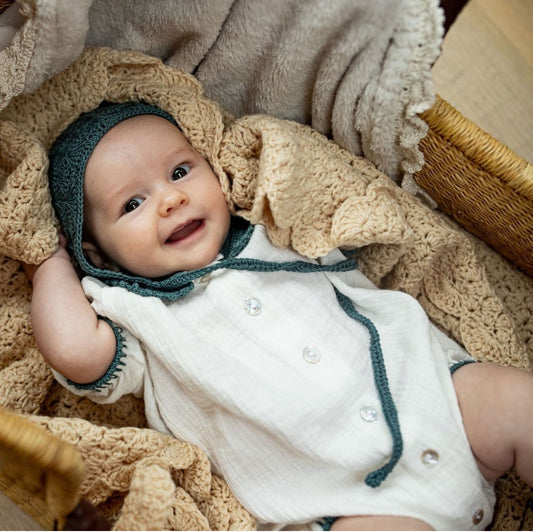 細部のデザインや品質にまでこだわり、ひとつひとつ丁寧にハンドメイドで仕上げられている美しいかぎ針編みが魅力のフェアトレードのベビーアイテムです.