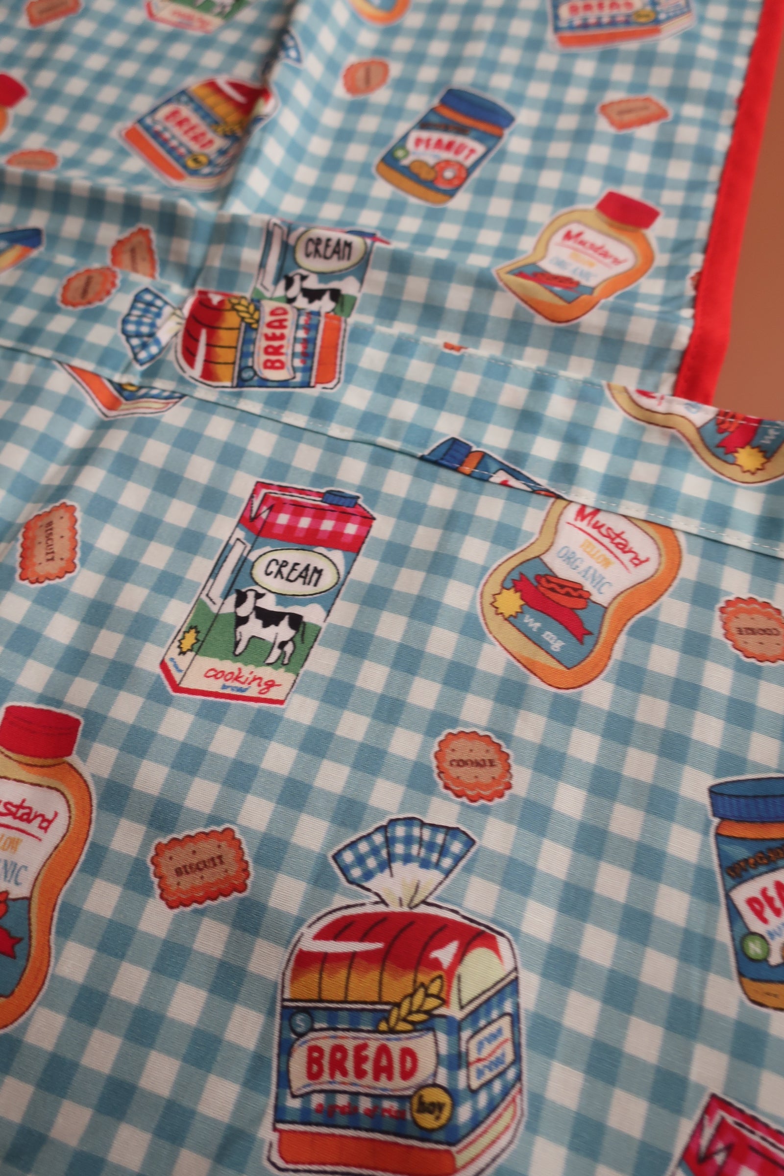 パンやミルク、ジャムが並ぶブレックファースト柄のエプロン。