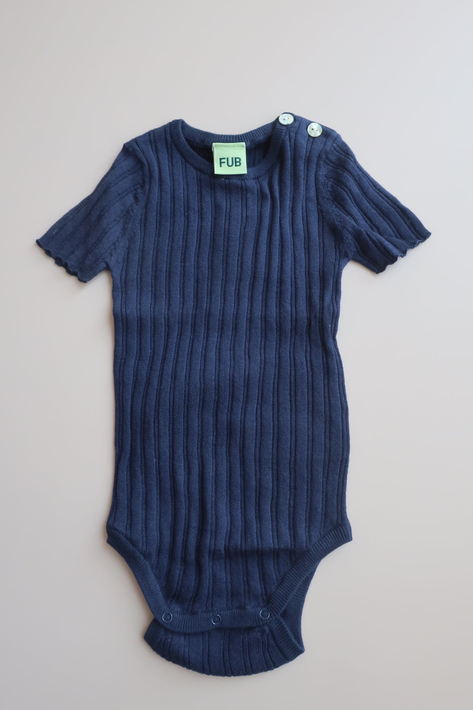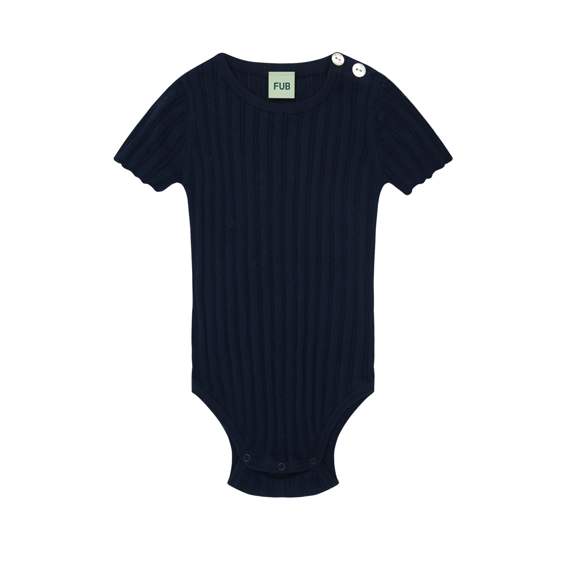 幅広のリブ編み構造で編まれたベビーボディ。半袖で丸首のリブネックラインが特徴です。肩には実用的なボタン留め(パール調シェルボタン)を、股部分にはスナップボタンを採用。オーガニックコットン製。