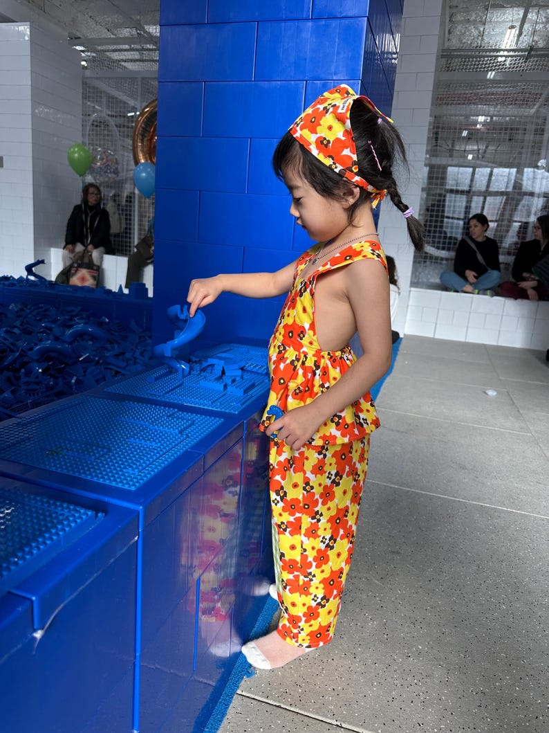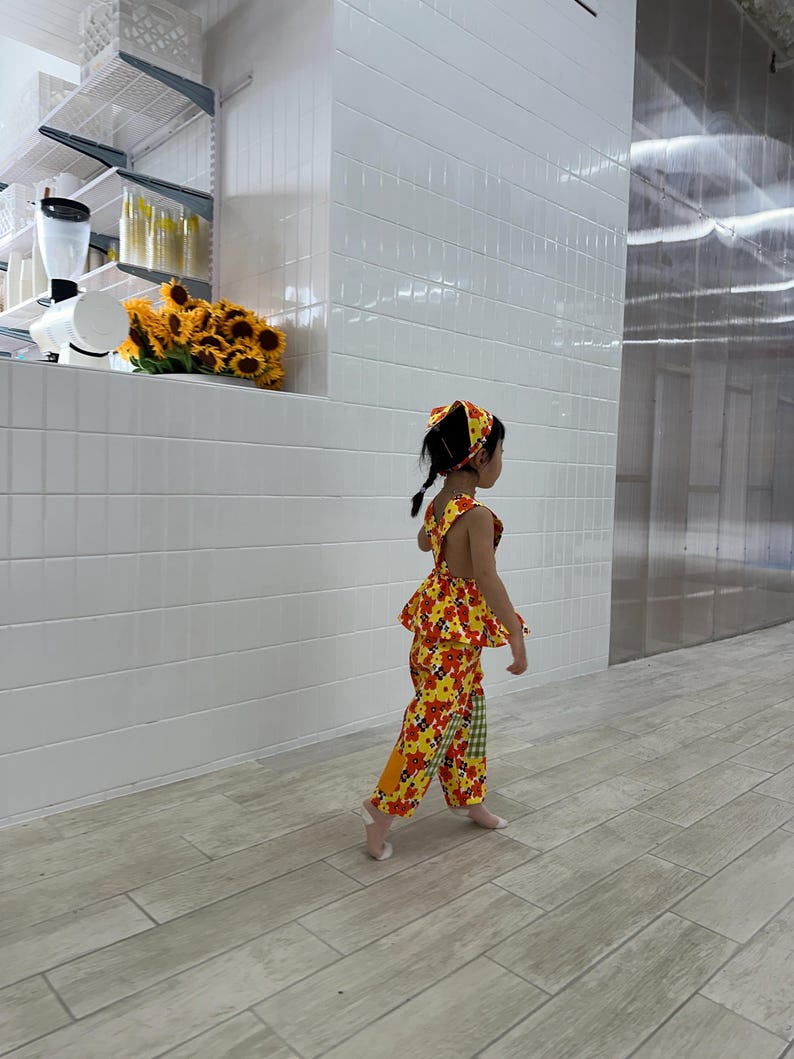 遊び心いっぱいの日に着やすい、明るく楽しいエプロン、パンツ、バンダナの3点セット。
