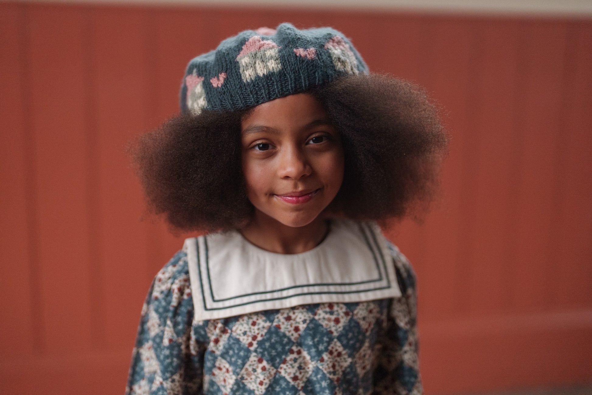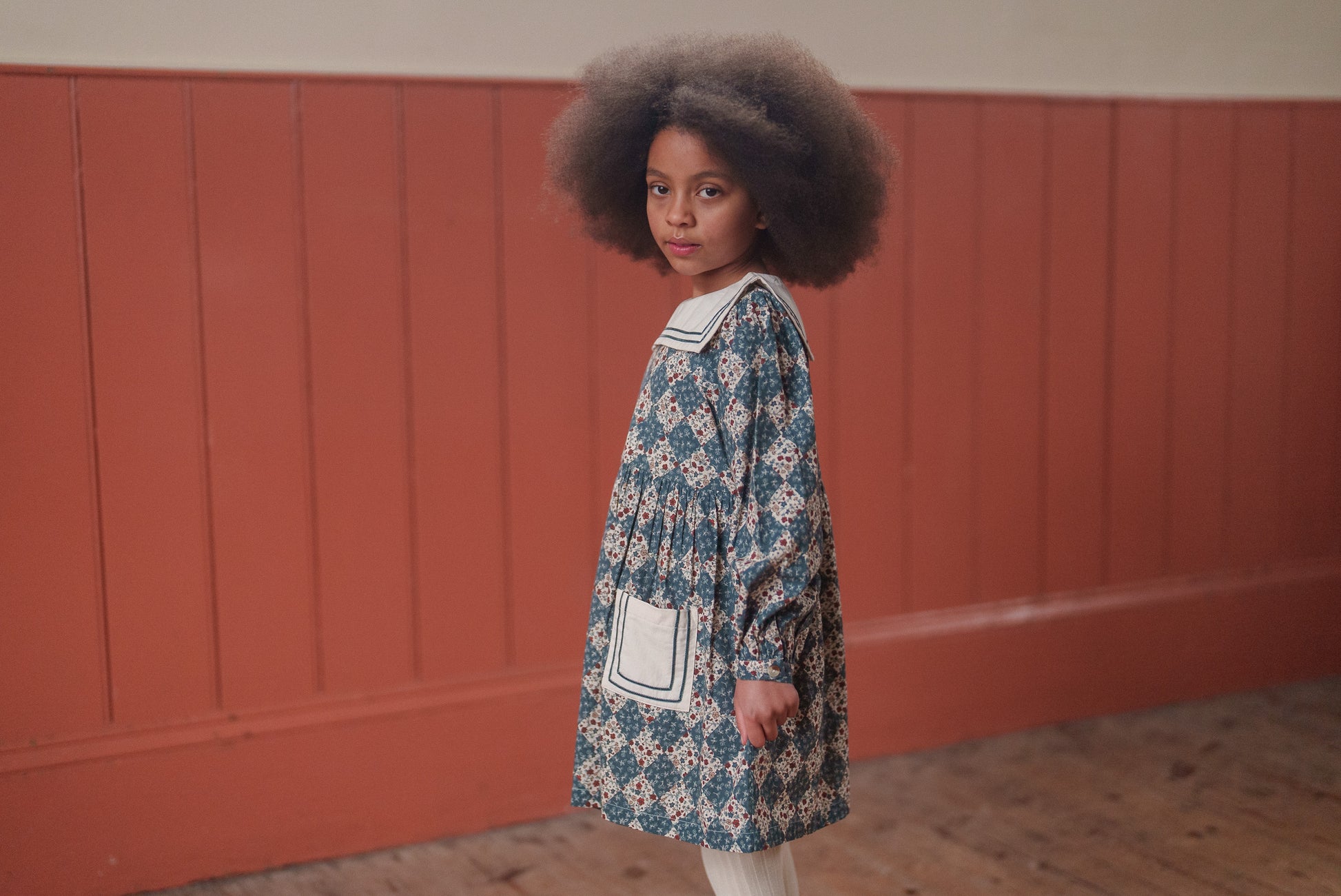 美しいエヴァセーラードレスは、オリジナルのオーガニックハーレクイン生地で作られています。コントラストの効いた白いセーラーカラーにはベルベットのリボンが二重に施され、フルスリーブは小さなボタン付きカフスで仕上げられています。また、ベルベットのリボンで縁取られたコントラストの効いたパッチポケットも特徴です。ドレスは背中でボタン留めになります。