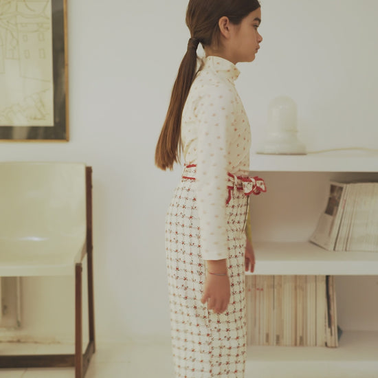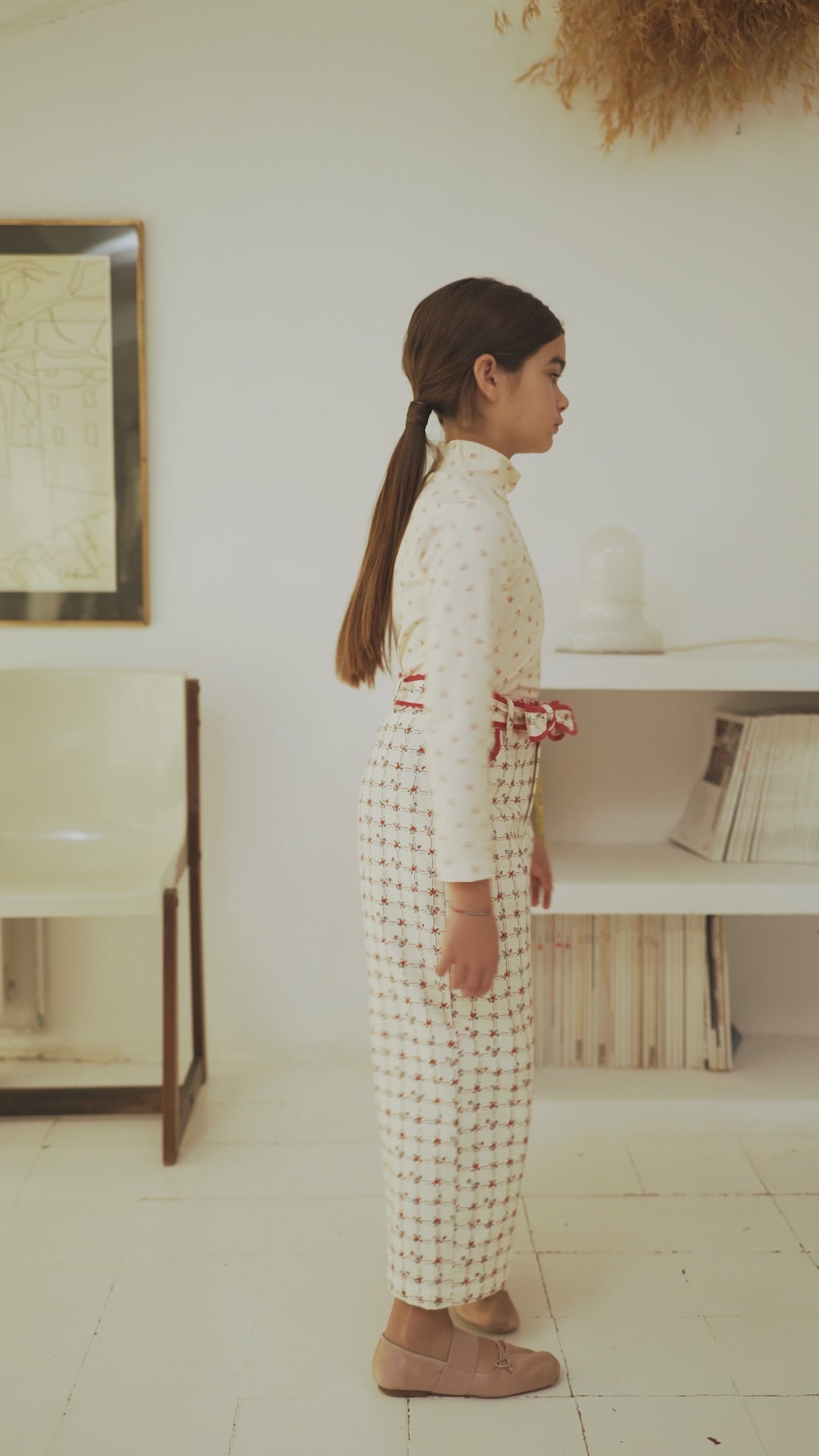 リッシーパンツのご紹介 ― 100%オーガニックコットンを使用した、特別なベベオーガニックコレクションに新たに加わった素敵な一品です。繊細な幾何学模様のフラワープリントと上品なコントラストパイピングが特徴で、日常の快適さとエレガントなヴィンテージテイストを融合させています。ワイドレッグシルエット、実用的なフロントポケット、同素材のベルト付き。今シーズン自信を持ってご紹介する、本当に素敵なアイテムです。