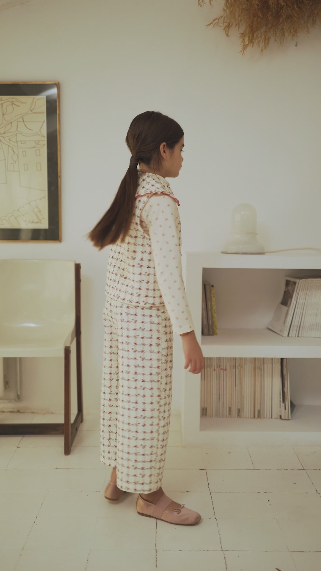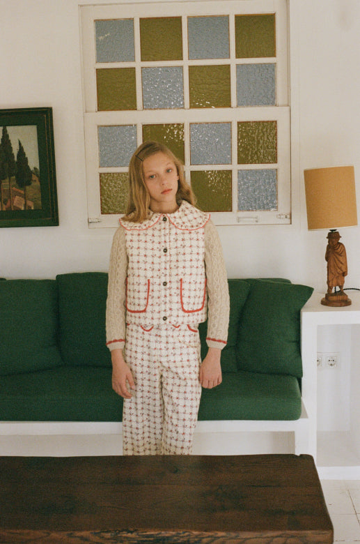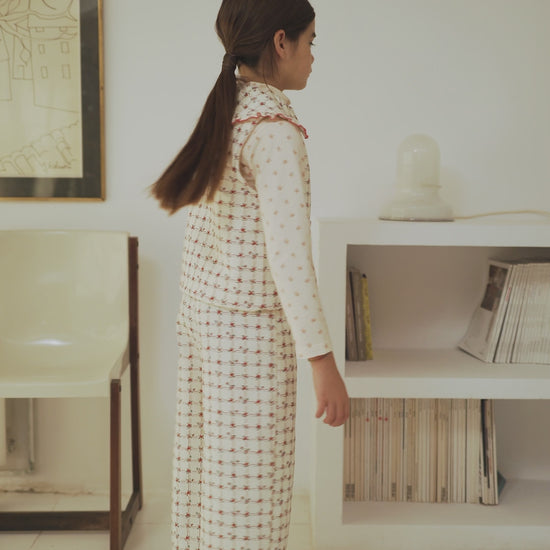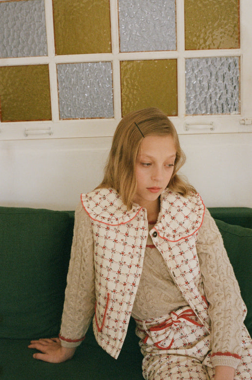 チャーミングなリッシーベストのご紹介 – 100%オーガニックコットンで作られた、時代を超えたレイヤリングアイテムです。ノスタルジックなヴィンテージスタイルで、Bebe Organicのために特別に開発された繊細な幾何学模様のフラワープリントが特徴です。スカラップのピーターパンカラー、コントラストパイピング、フロントパッチポケットをデザイン。内側は心地よいシープスキン風素材で全面裏地付き、アンティーク調のメタルボタンで留めることができます。子供時代の優雅さのエッセンスを捉えた、まさに特別なアイテムです。