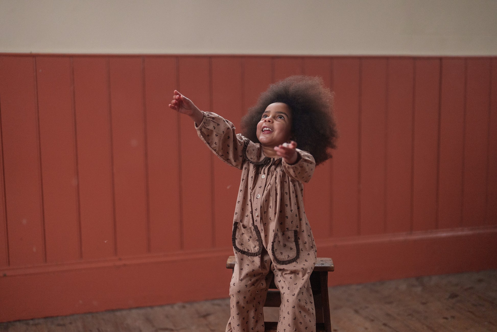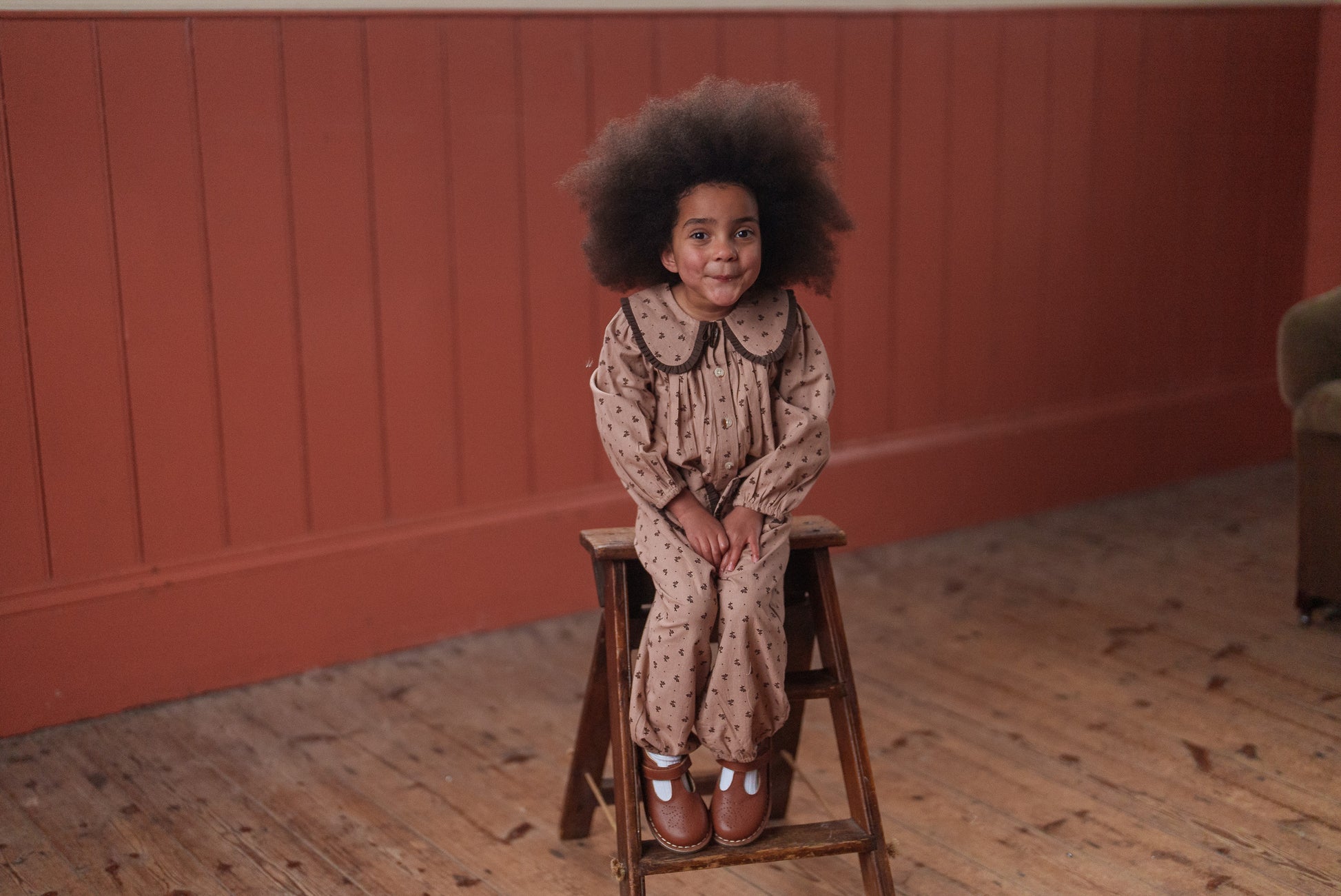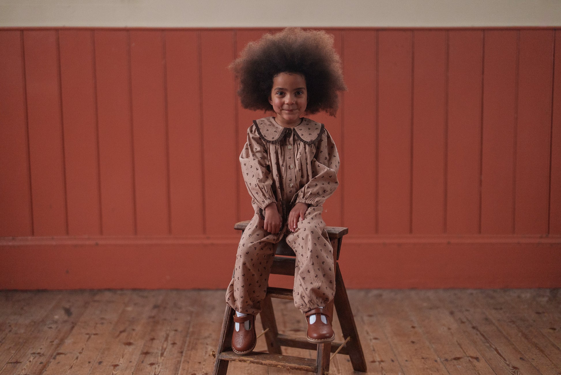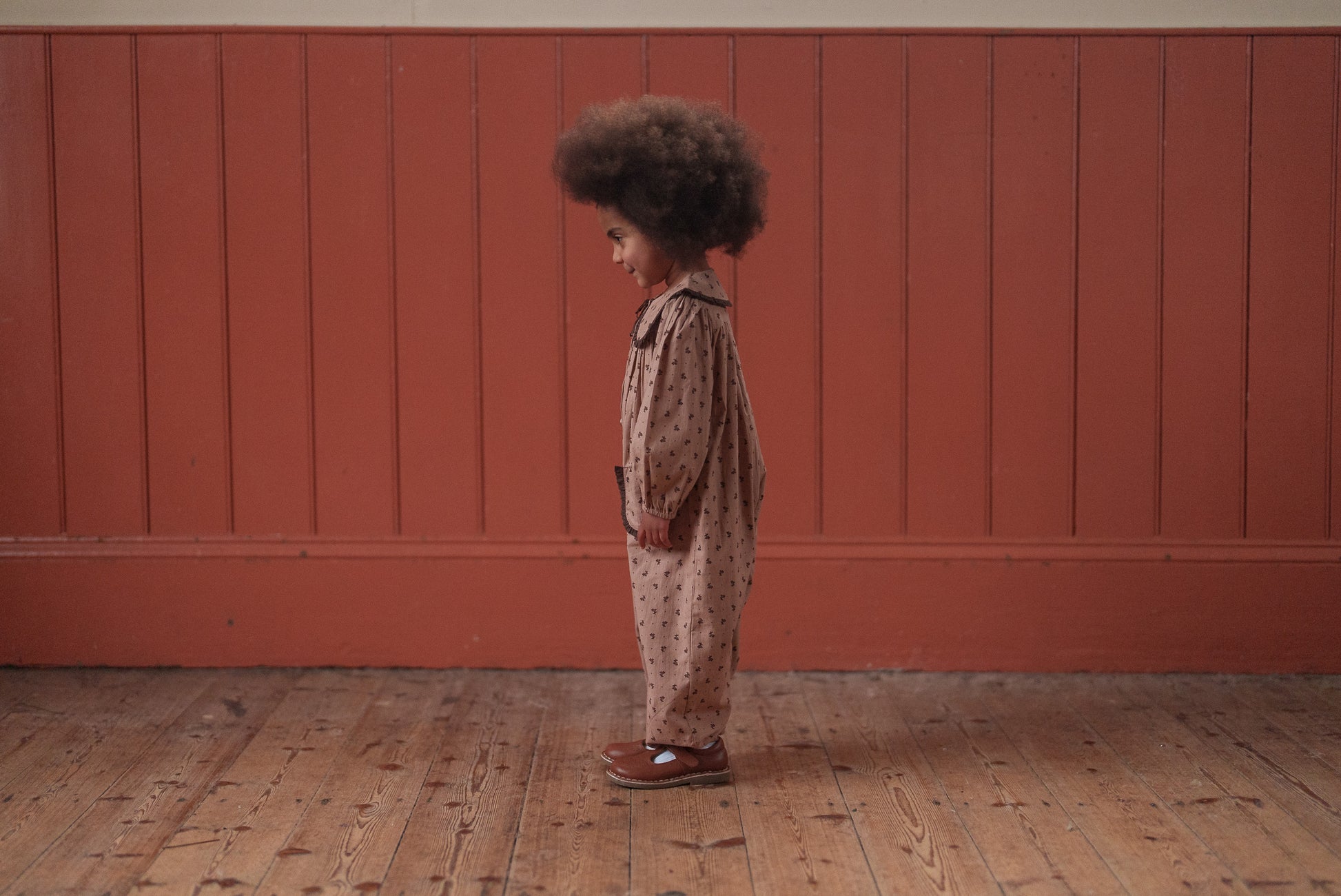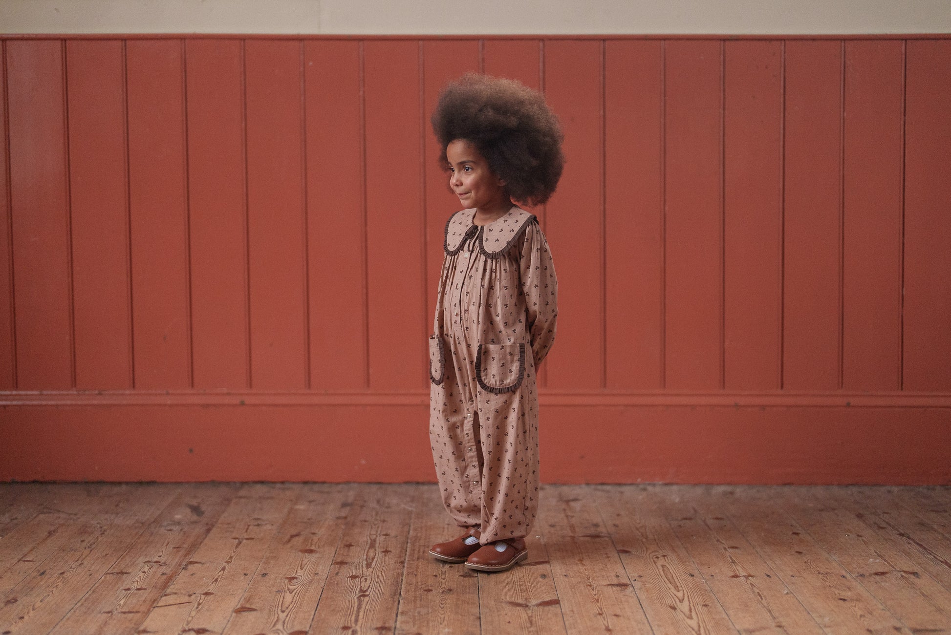 美しいオーガニックローズヒップフローラル生地を使用したフルレングスのロンパースです。ヴィンテージ風の可愛らしいデザインで、縁までギャザーを施したフリル付きのオーバーサイズカラーと、トリム付きパッチポケットが特徴です。ゆったりとしたフィット感で、動きやすく遊びやすい仕様。フルスリーブにはゴム入りカフス、足首部分にもゴムを採用。着脱やオムツ替えがしやすいスナップボタン開閉式です。