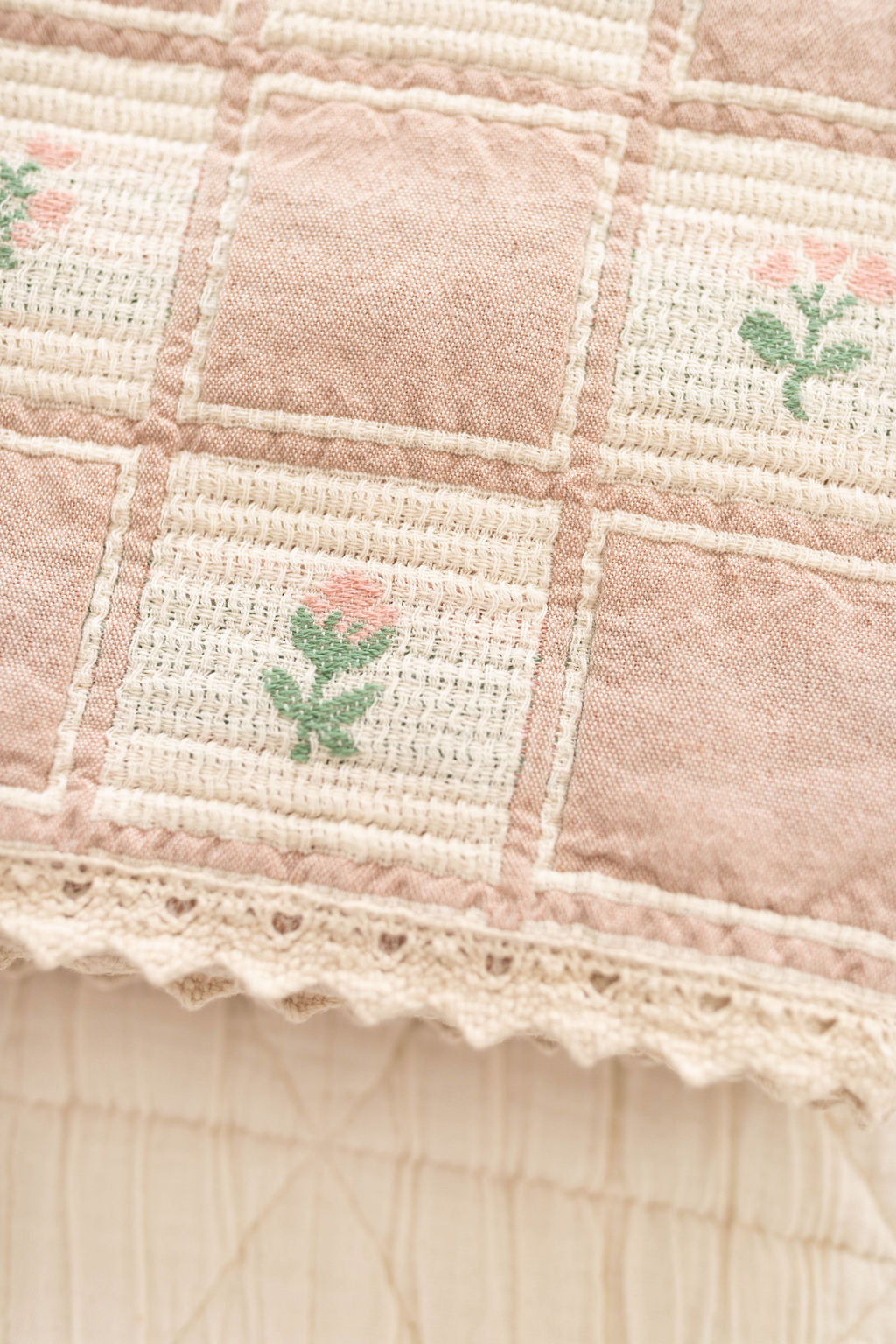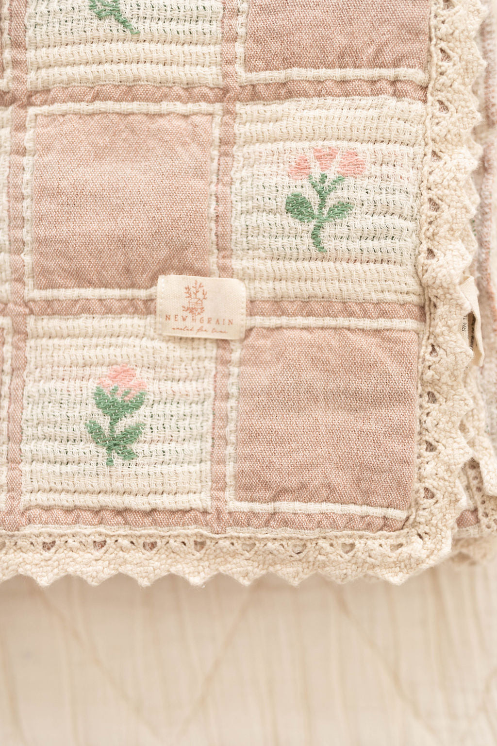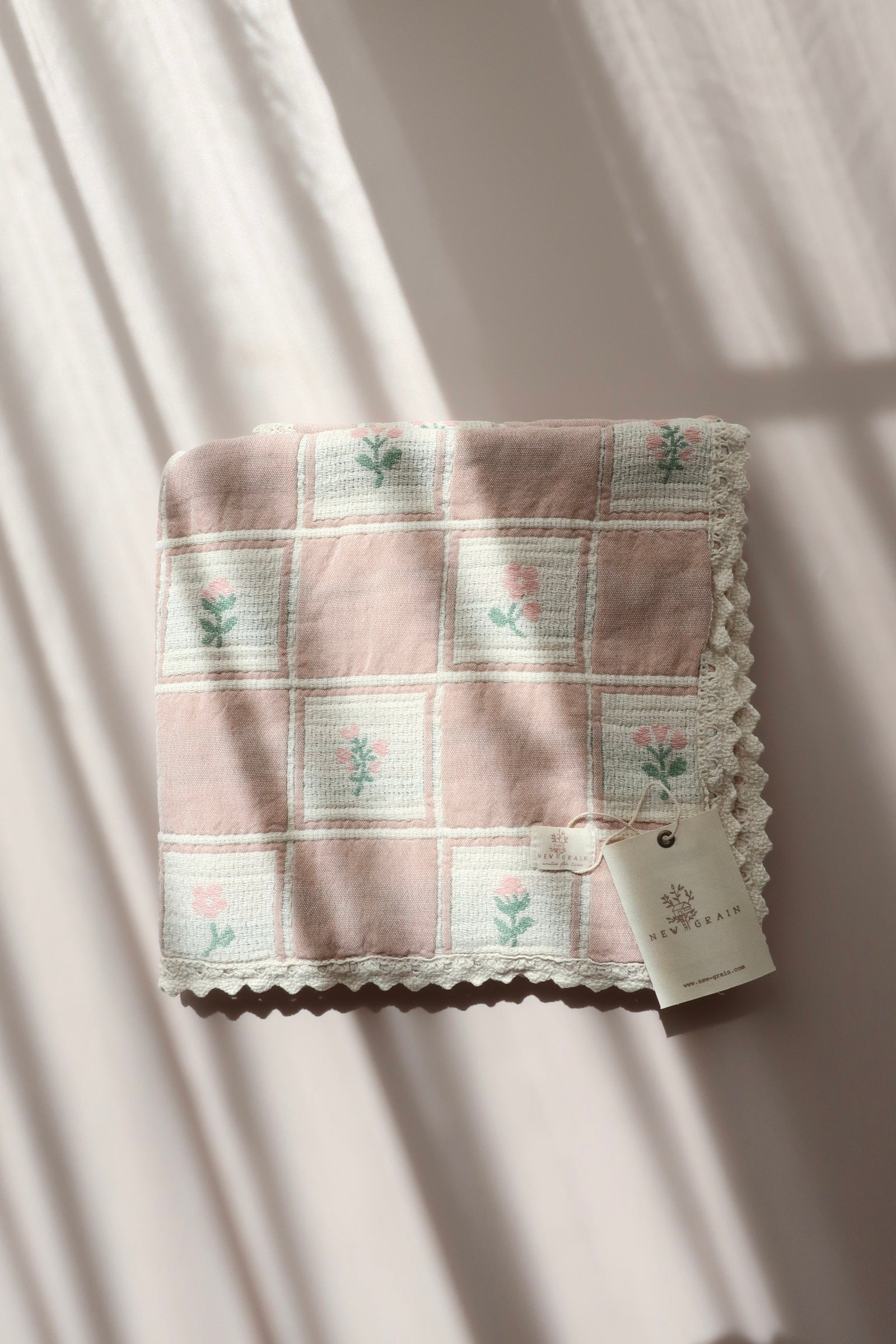 「Fleur」は、シンプルで上品な雰囲気のパッチワークブランケット。デリケートな赤ちゃんの肌にもやさしく、ベビー用品としても安心。リビングやベビーベッドでの使用はもちろん、長く愛用できるので出産祝いやお誕生日プレゼントにも喜ばれます。
