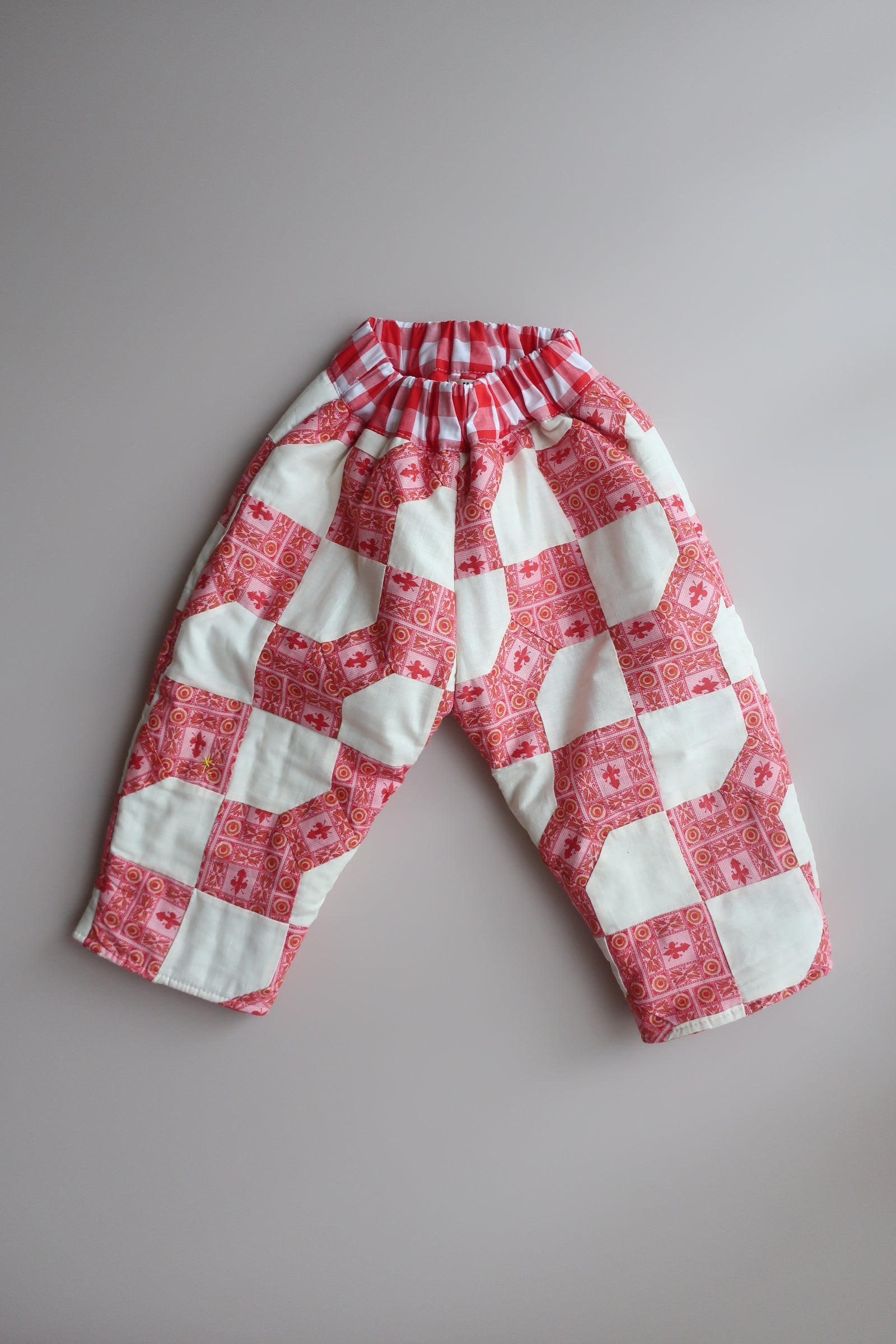 ヴィンテージ生地作られた遊び心たっぷりのキルトパンツ。