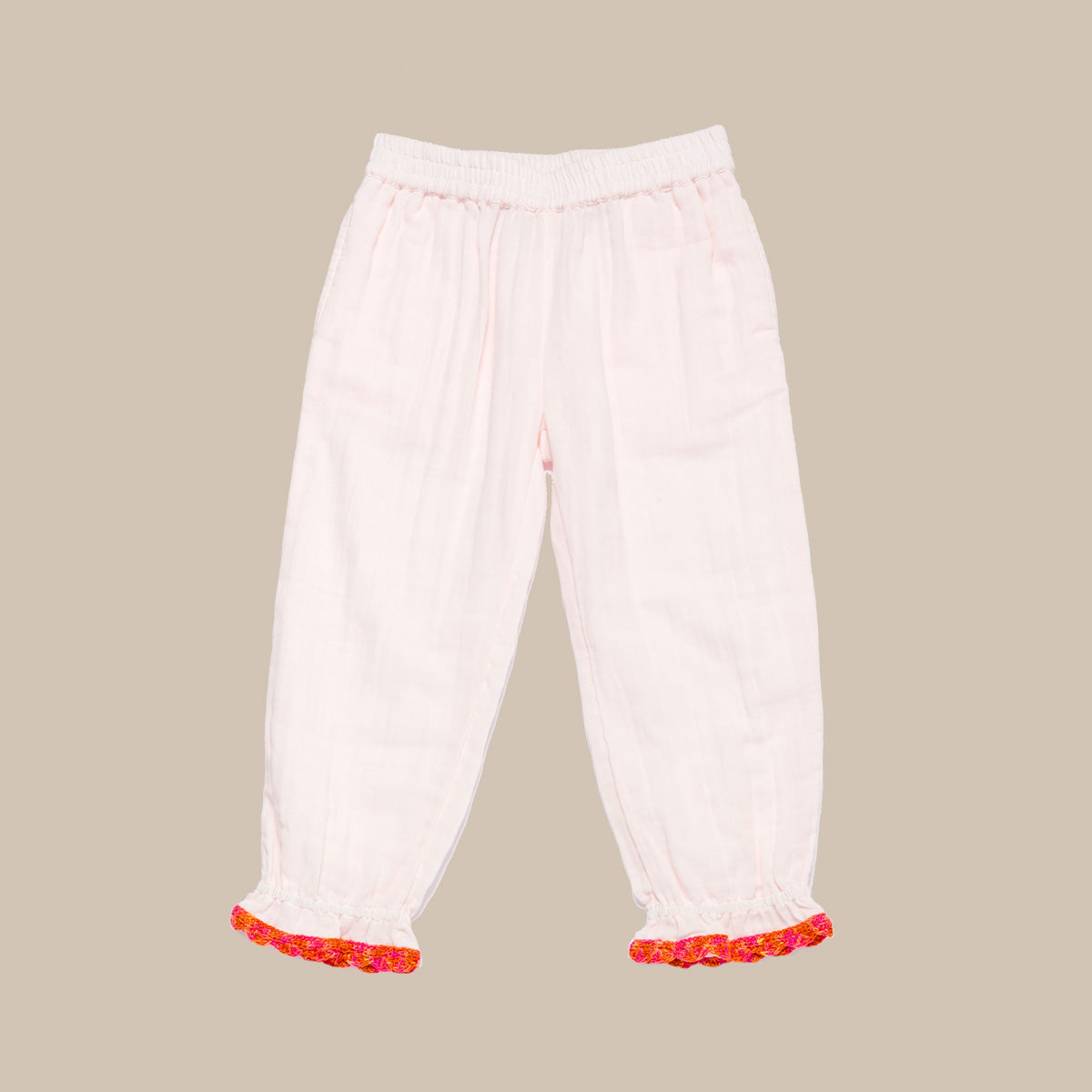 足首にクロシェ編みのトリムが施された、甘い雰囲気のゴム入りカフパンツ。ポケット付きで、快適なワイドゴムウエストバンドを採用。コレクション内の様々なスタイルと組み合わせ可能ですが、特にムスリン素材のOLGAブラウスとの組み合わせが絶妙です。
